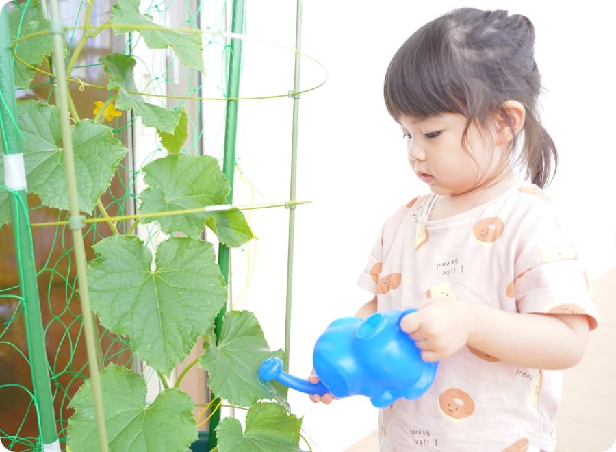 子どもたちがプランターで野菜を育て、収穫の喜びを体験。土に触れ、命を育む過程で、食への興味や「食べる」ことへの感謝の心が芽生えます。野菜を育てて食べる姿から、食育による成長やキラキラの好奇心を実感できます。